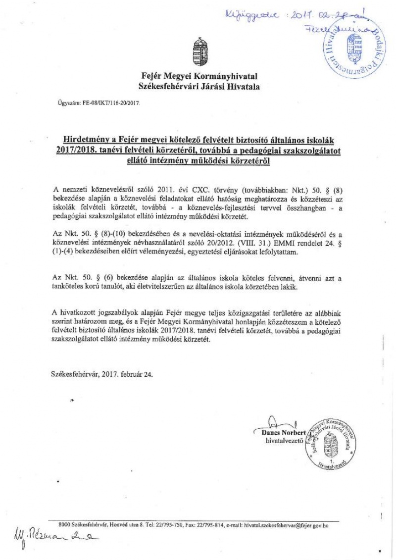 a Fejér megyei kötelező felvételt biztosító általános iskolák 2017/2018. tanévi felvételi körzetéről, továbbá a pedagógiai szakszolgálatot ellátó intézmény működési körzetéről