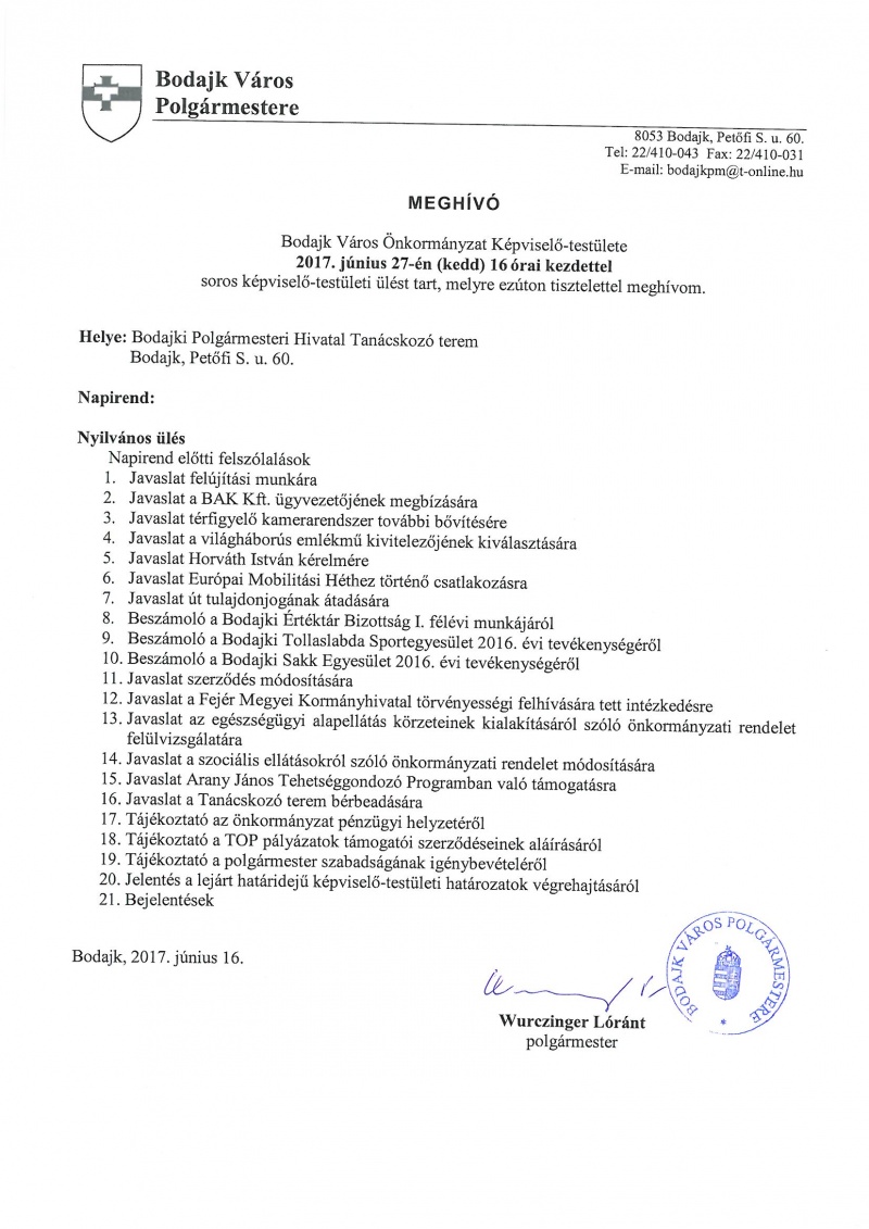Meghívó a 2017. június 27-i soros képviselő-testületi ülésre