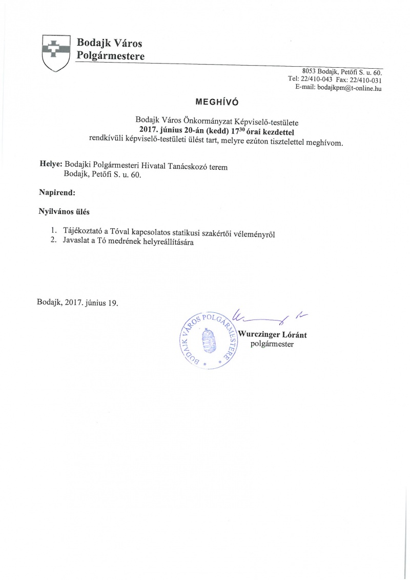 Meghívó a 2017. június 20-i rendkívüli képviselő-testületi ülésre