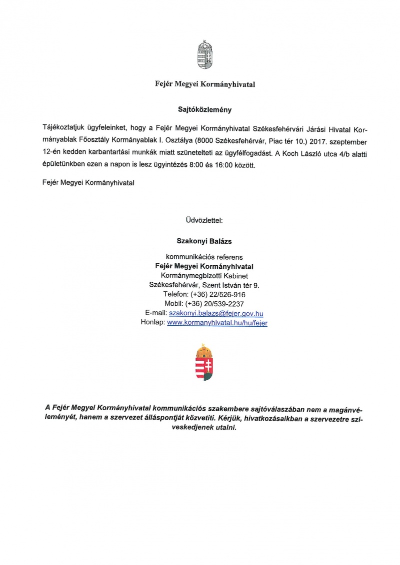 A Fejér Megyei Kormányhivatal szeptember 12-i ügyfélfogadás szüneteltetéséről
