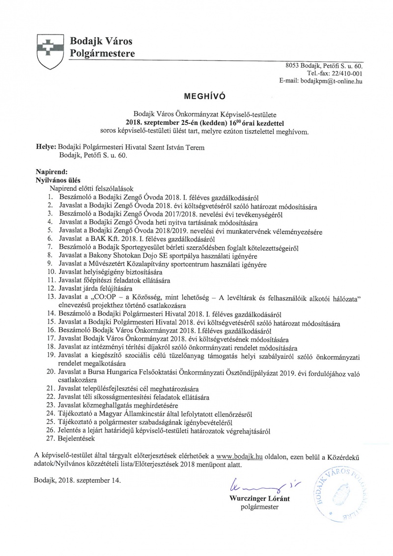 Meghívó a 2018. szeptember 25-i soros képviselő-testületi ülésre