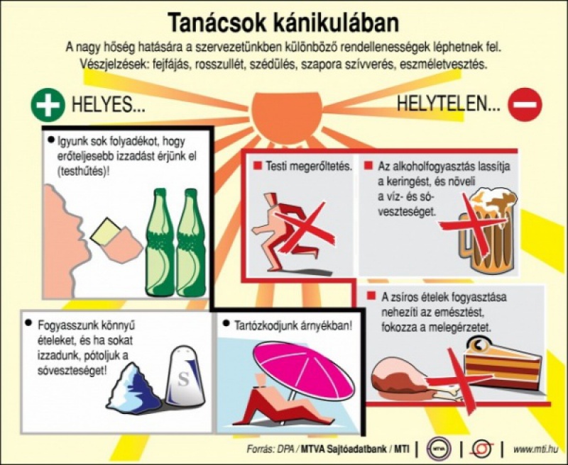 A tartós hőség miatt, az átlagosnál melegebb időben az egészséges szervezetet is extrém igénybevétel éri. A szív- és a keringési betegségben szenvedőkön túl ilyenkor bárkinél előfordulhatnak egészségügyi panaszok. Akik a hőség ellenére gépjárműbe kényszerülnek, fokozott óvatossággal vezessenek, hiszen a koncentrációt negatívan befolyásolhatja a meleg. A déli órákban a vízparton pihenők is kerüljék a napozást, valamint ne ugorjanak a vízbe felhevült testtel.
