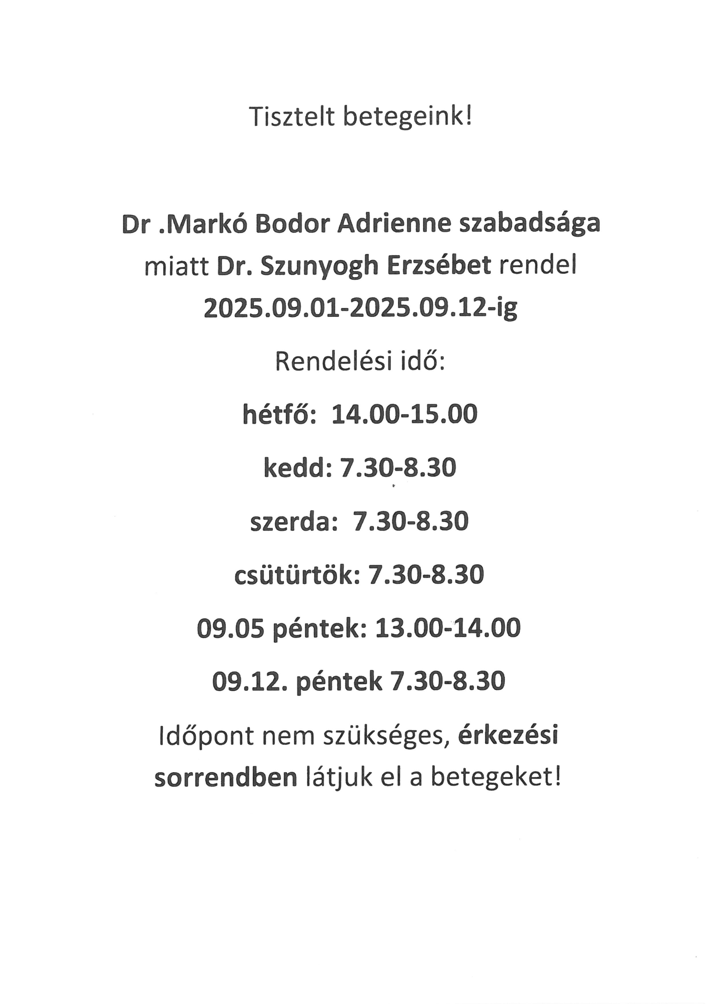 dr. Markó-Bodor Adrienne háziorvos szabadságáról 2025.09.01.-09.12.