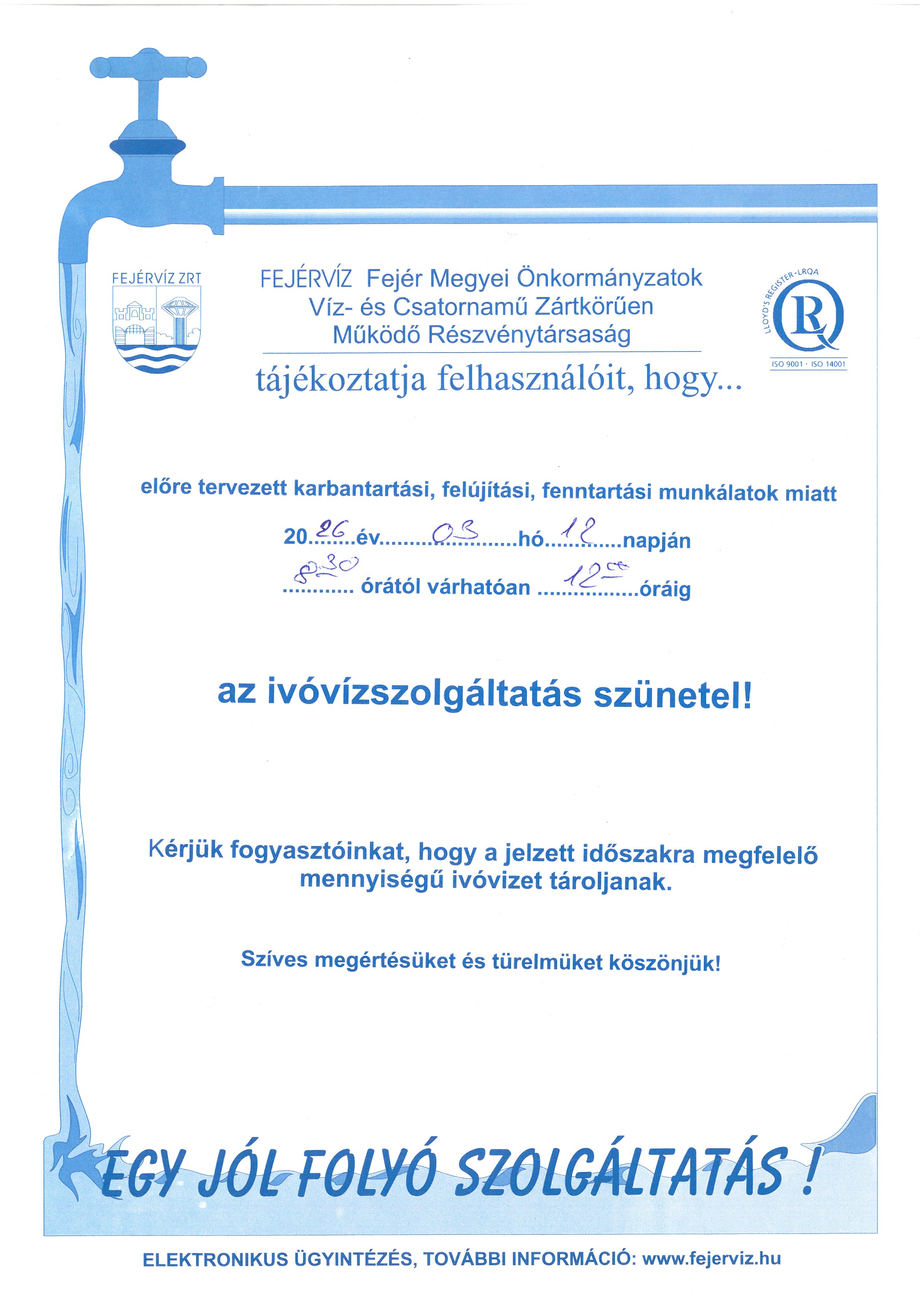 ivóvízszolgáltatás szüneteltetéséről 2026.03.12. csütörtökön 8.30-12.00 óra között. Ha szükséges, akkor lajtoskocsiból ívóvíz vételezhető a BAK Kft. előtt ezen időszak alatt.