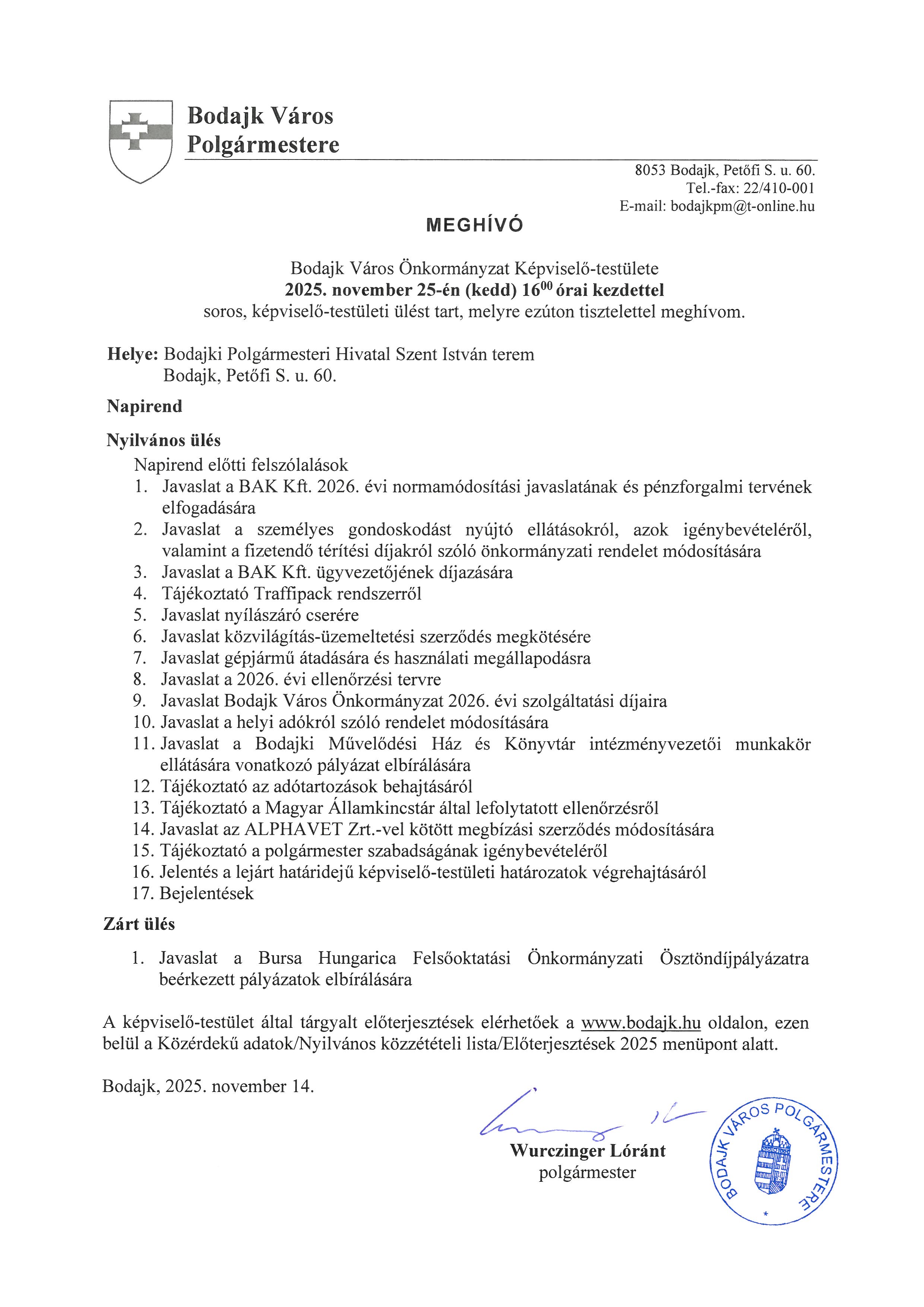 a képviselő-testület 2025. november 25-i soros ülésére