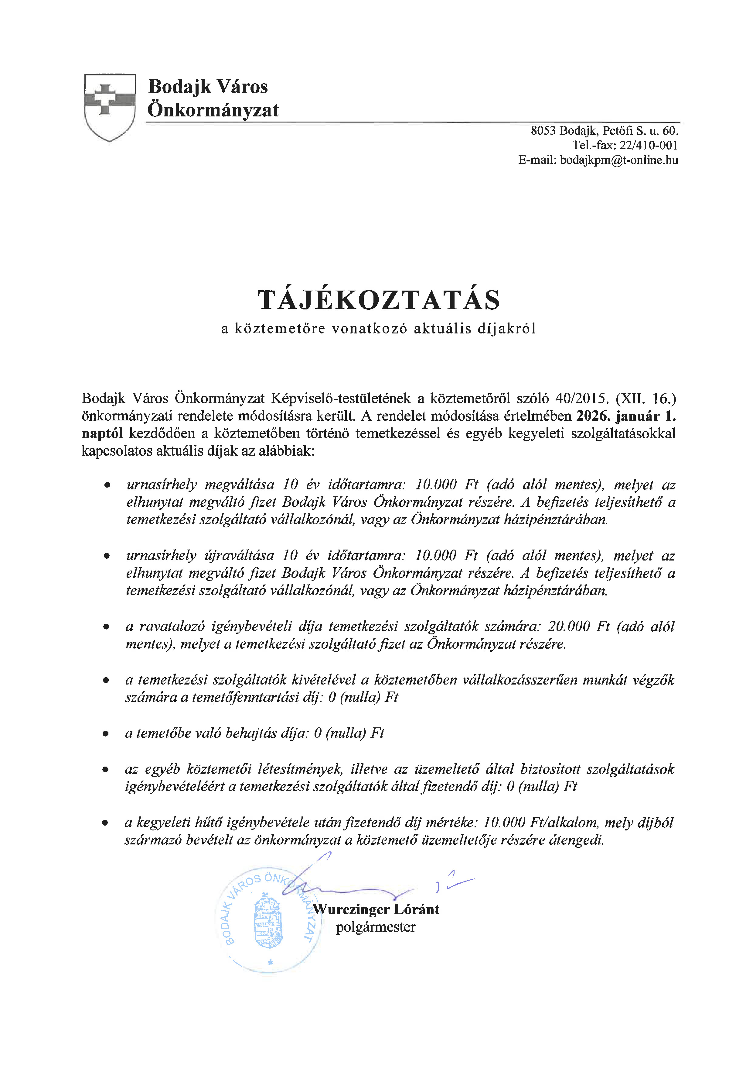 a köztemetőre vonatkozó aktuális díjakról