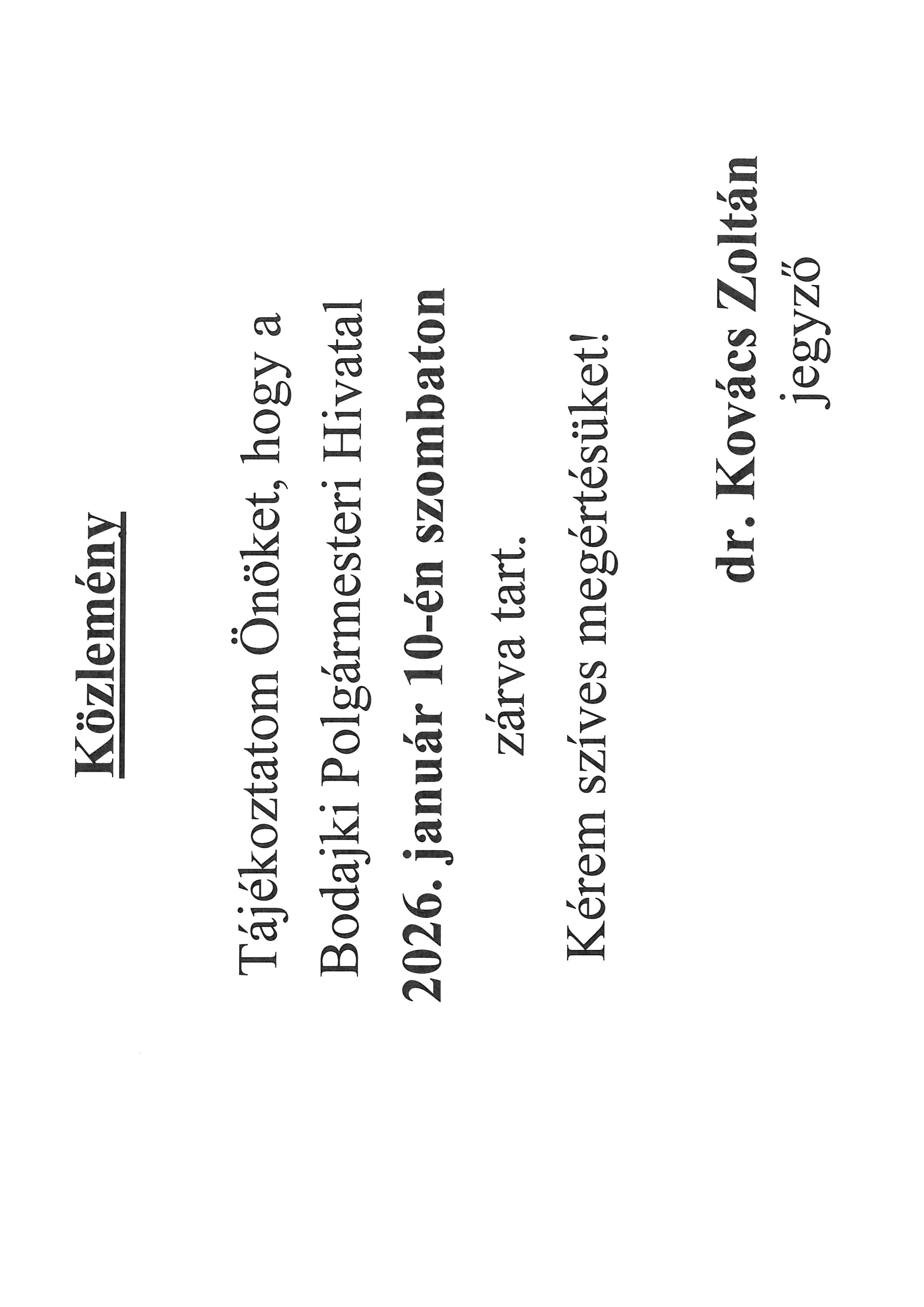 a Bodajki Polgármesteri Hivatal 2026. január 10-i zárva tartásáról