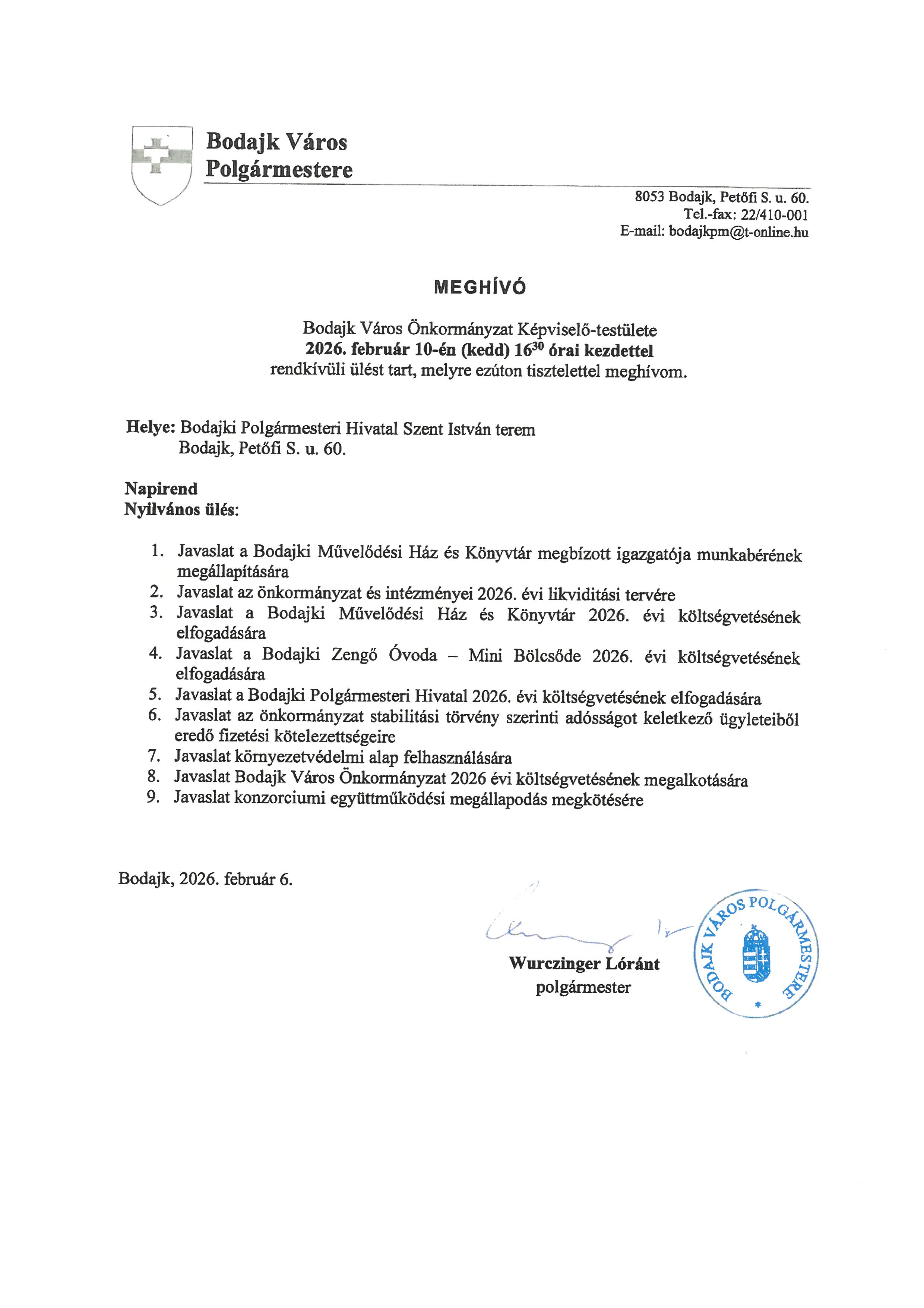 a képviselő-testület 2026. február 10-i rendkívüli ülésére