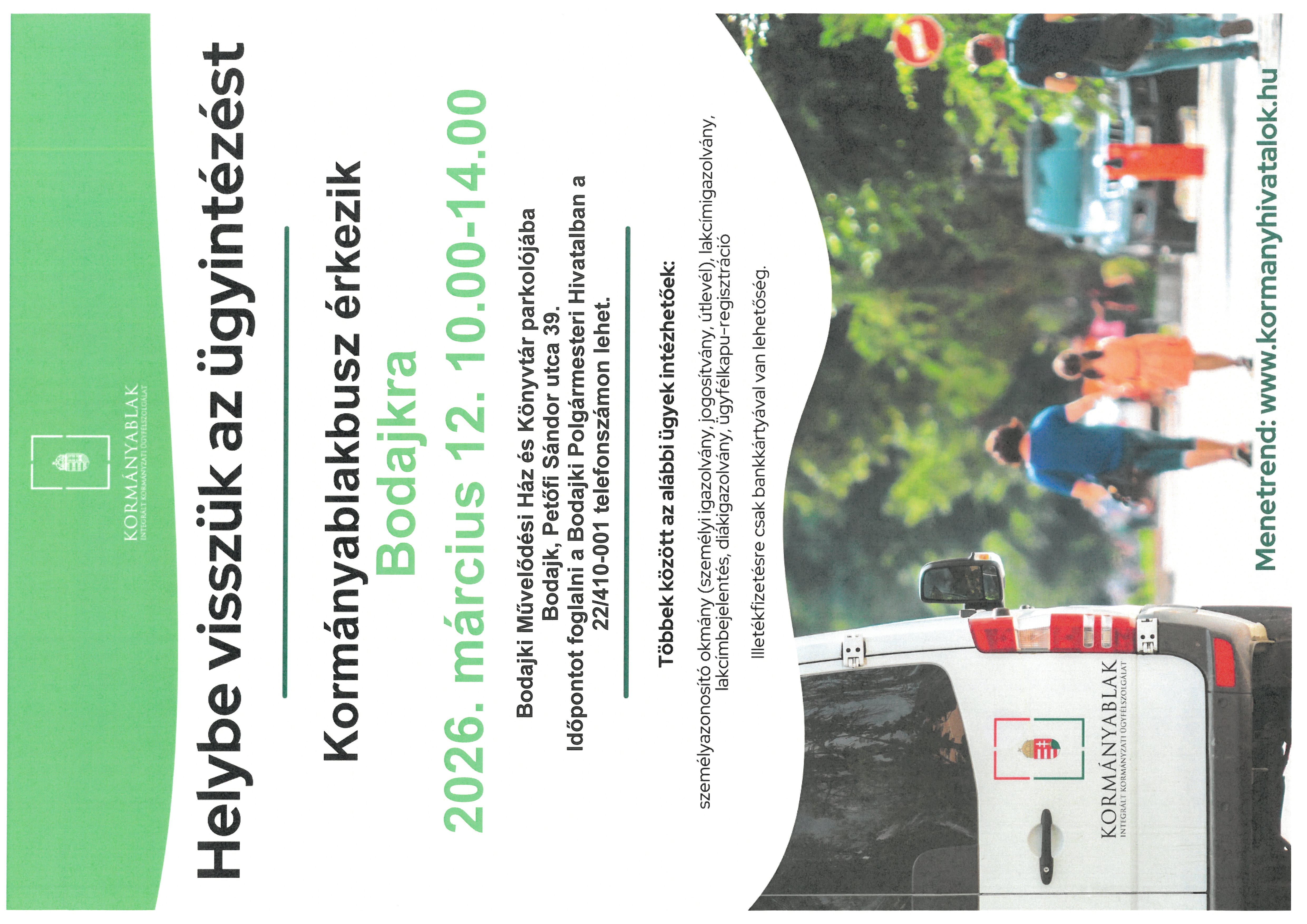 a KAB busz 2026. március 12. érkezéséről, időpontot foglalni a Bodajki Polgármesteri Hivatal 22/410-001 telefonszámán lehet.