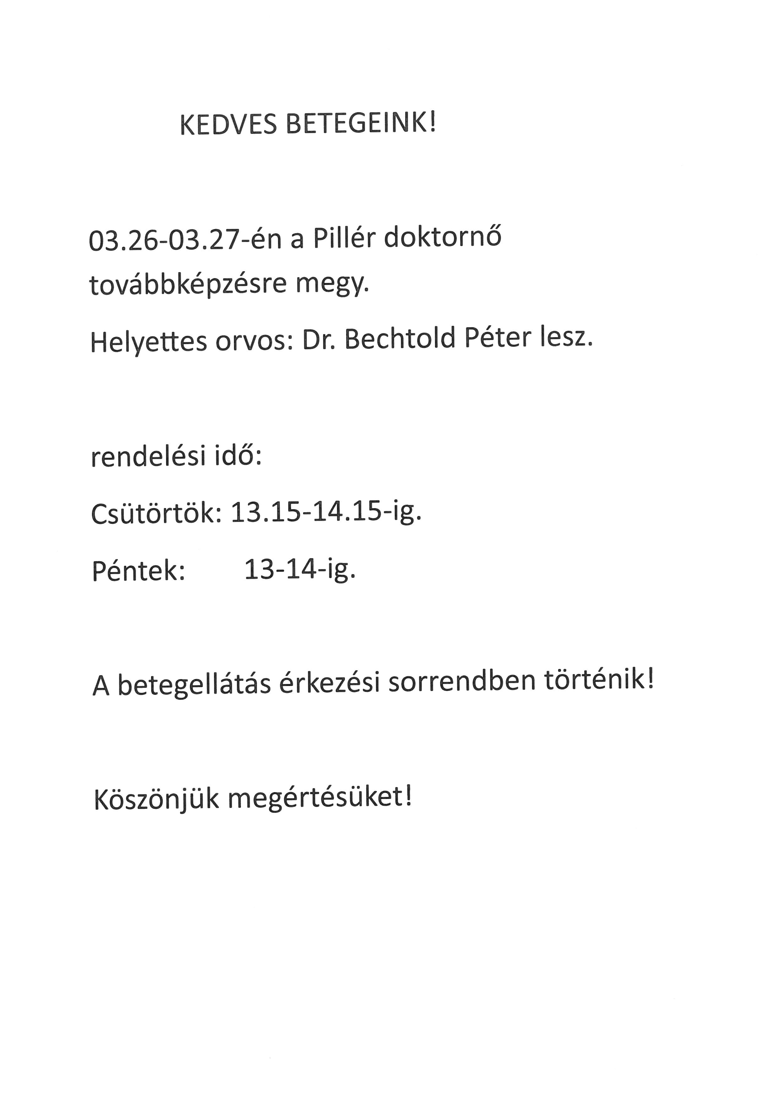 dr. Pillér Ágnes háziorvos szabadságáról 2026.03.26.-03.27.