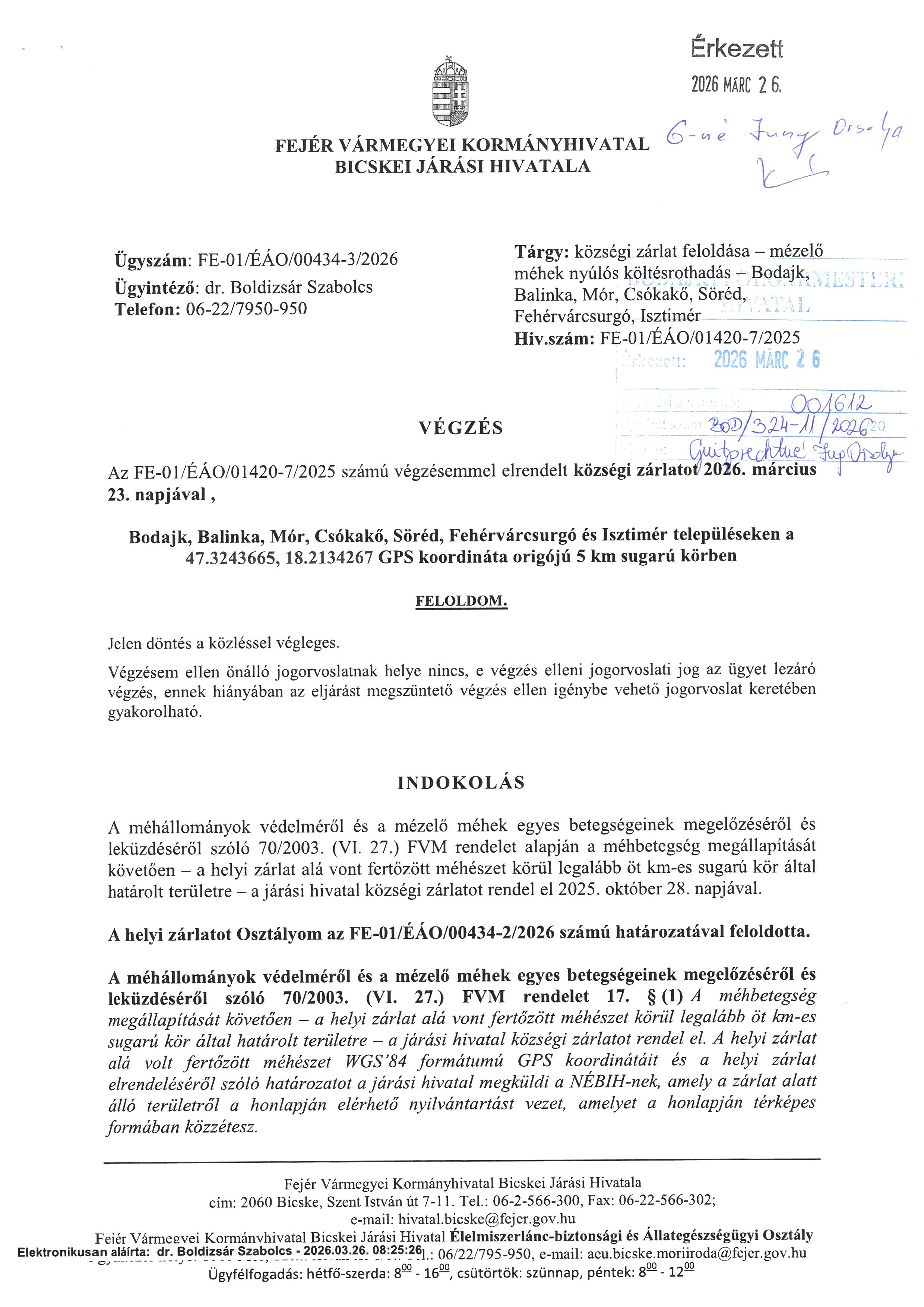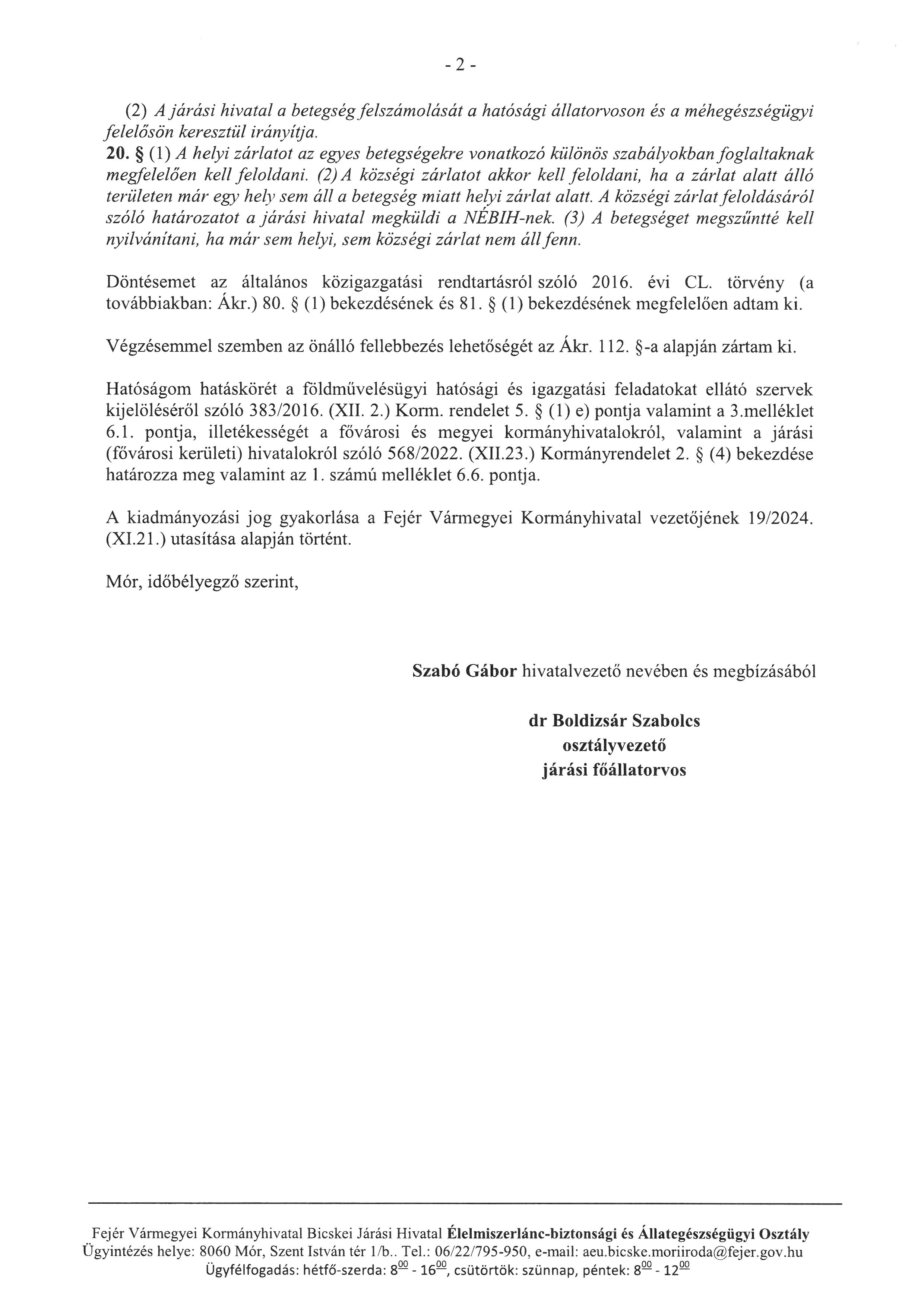 községi zárlat feloldásáról - mézelő méhek nyúlós költésrothadása ügyében