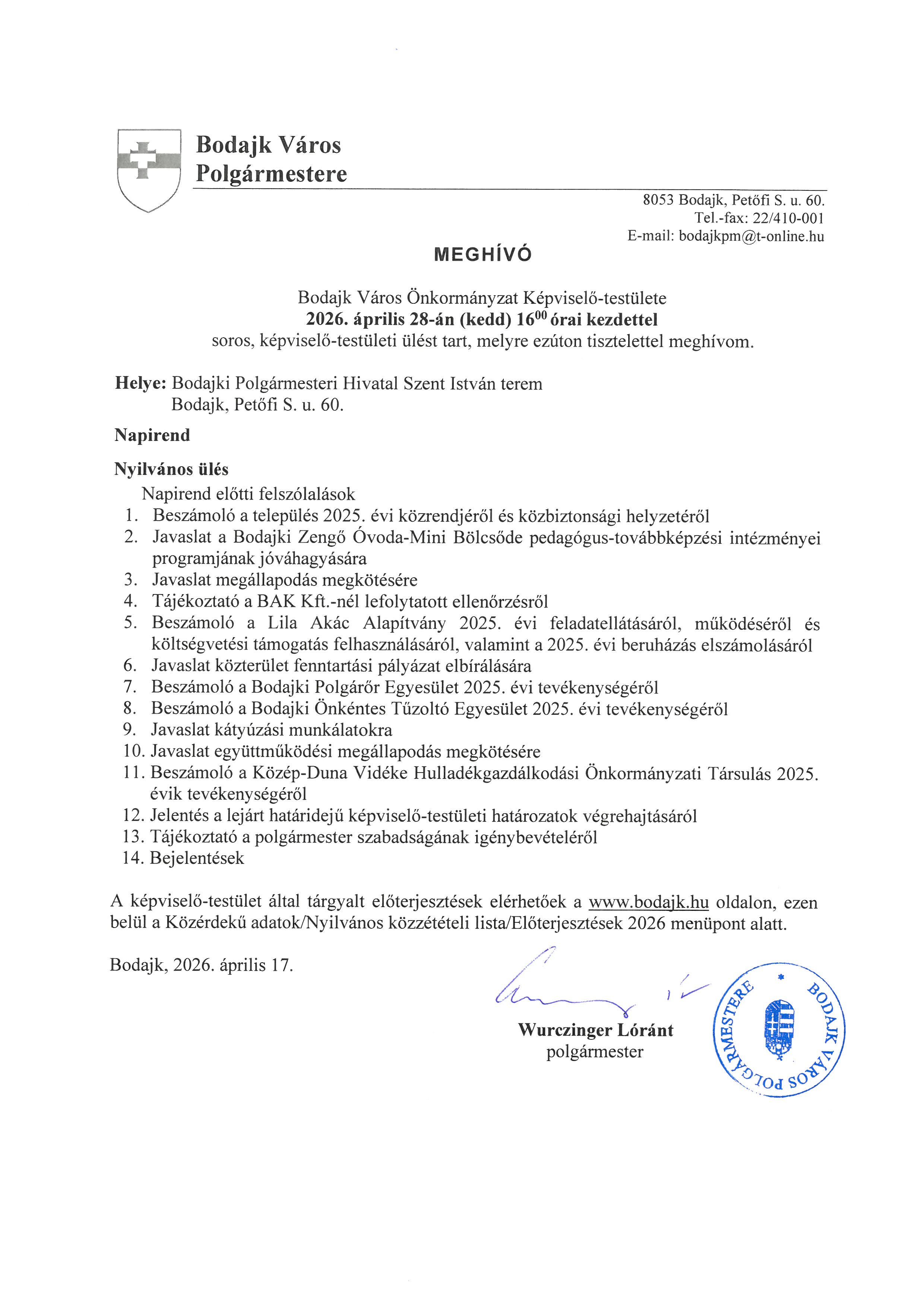 a képviselő-testület április 28-i soros ülésére